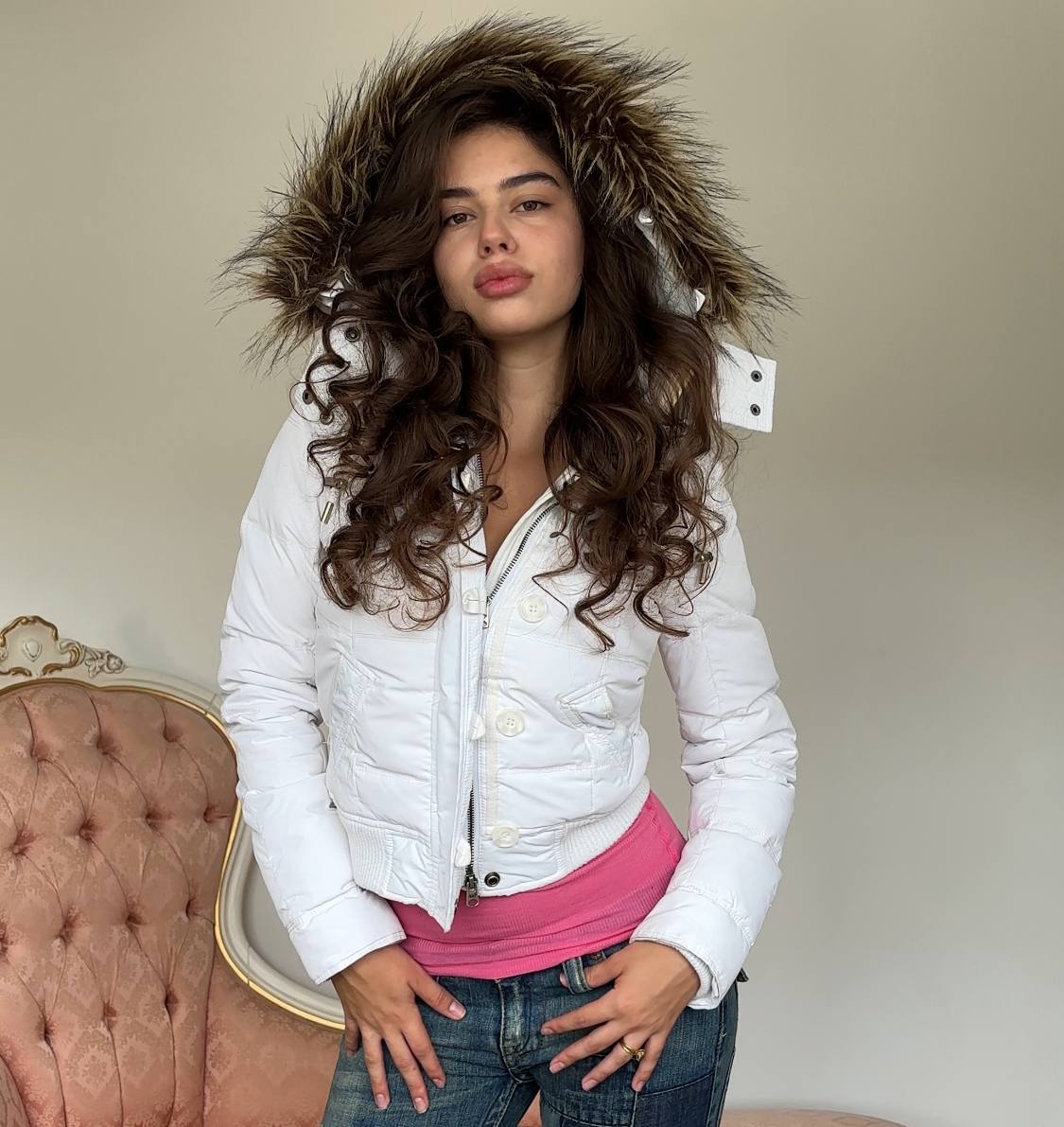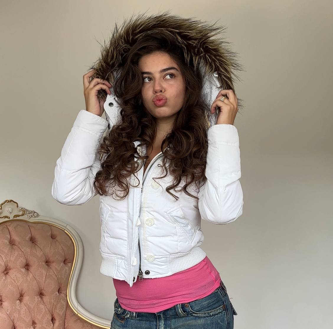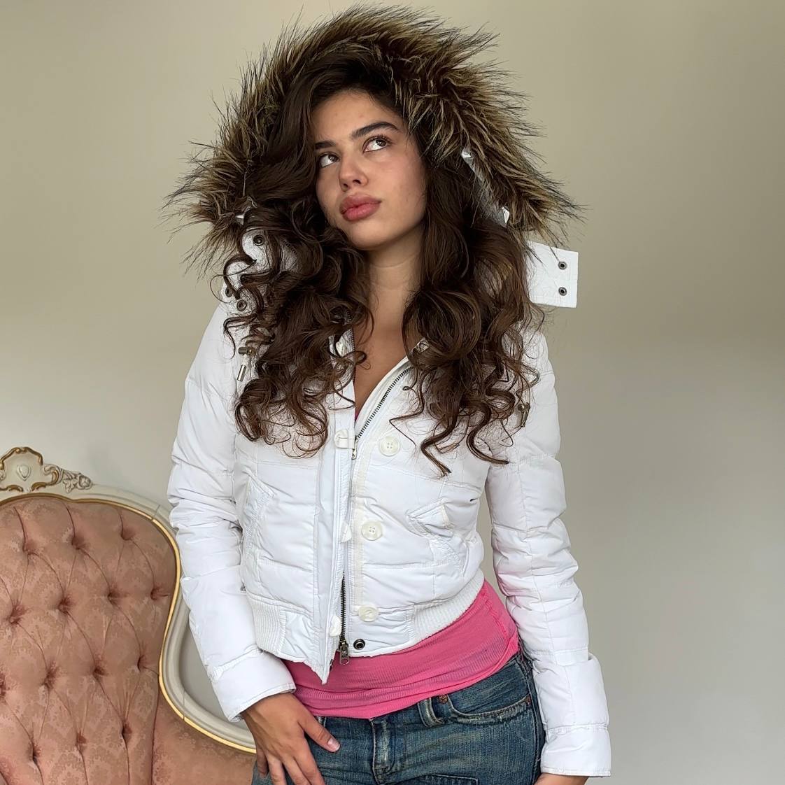 💋 iconic A&F Jennifer’s body style cropped puffer in white, has a corset effect and beige fur hood