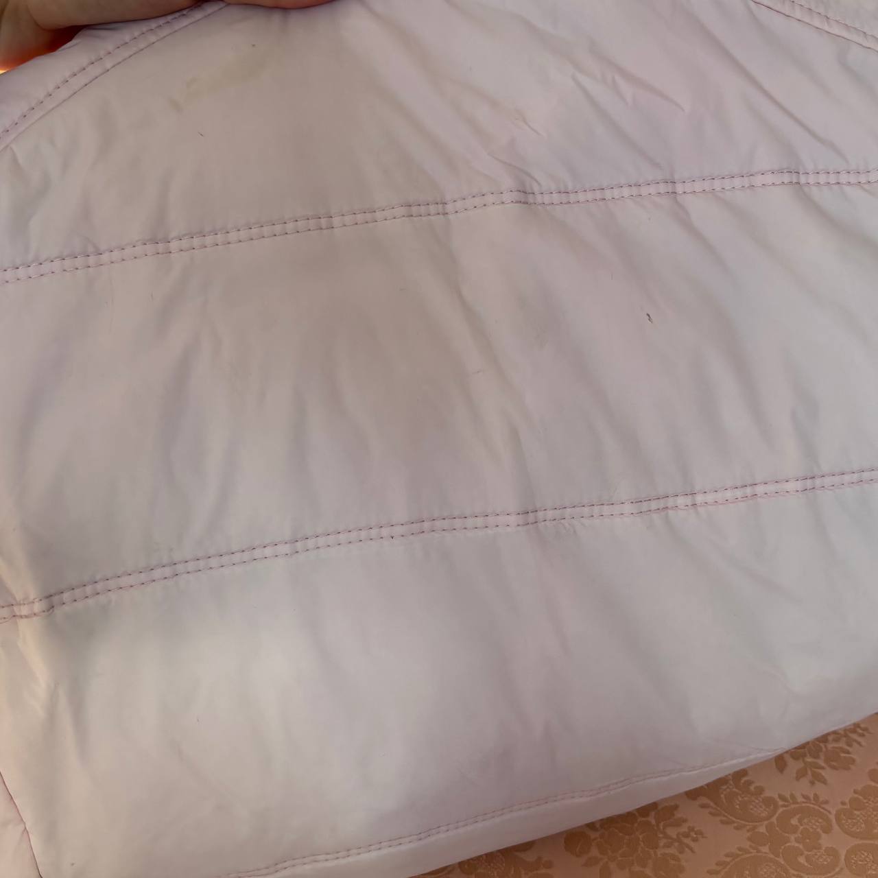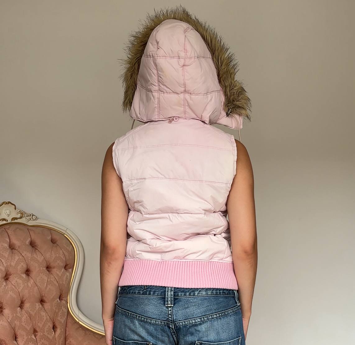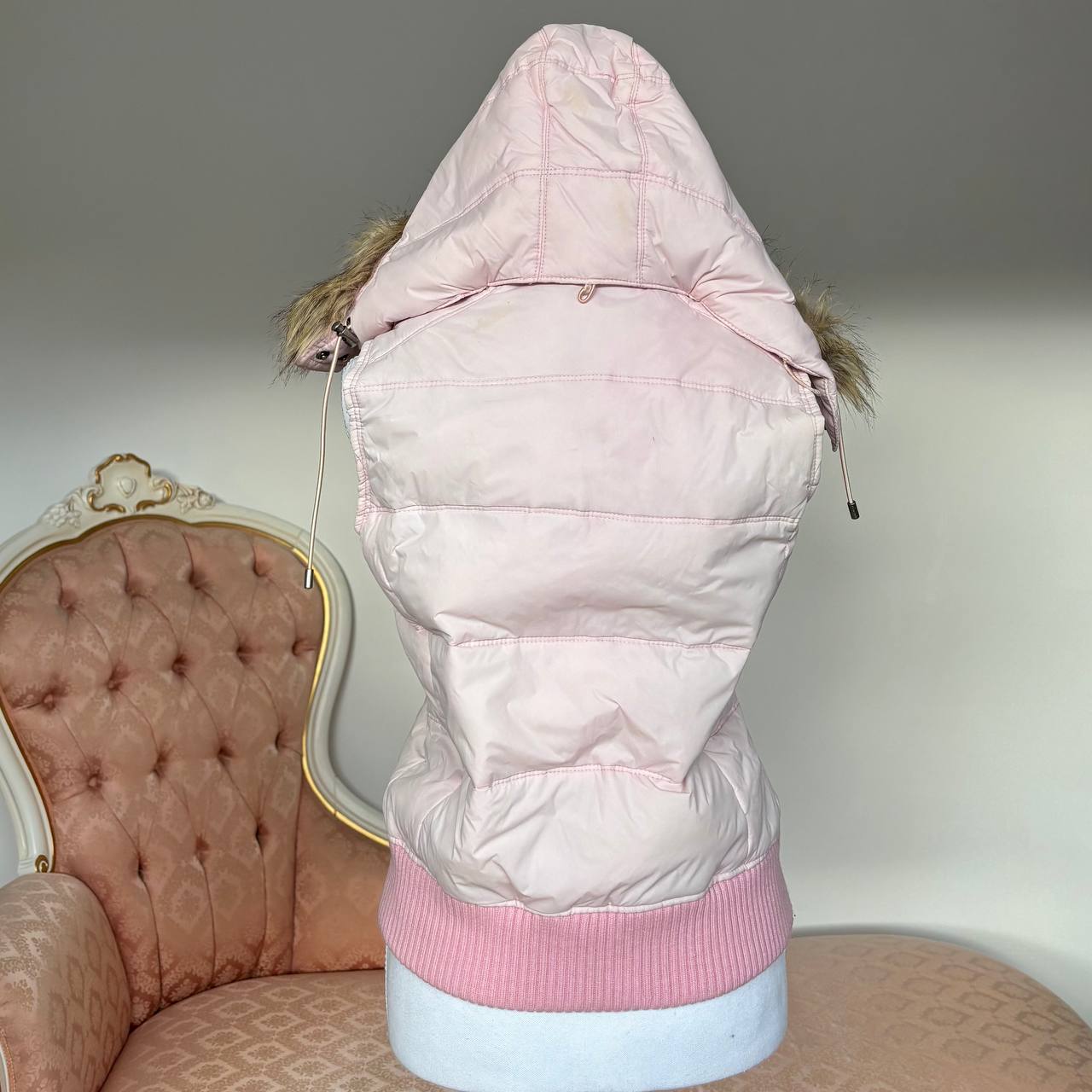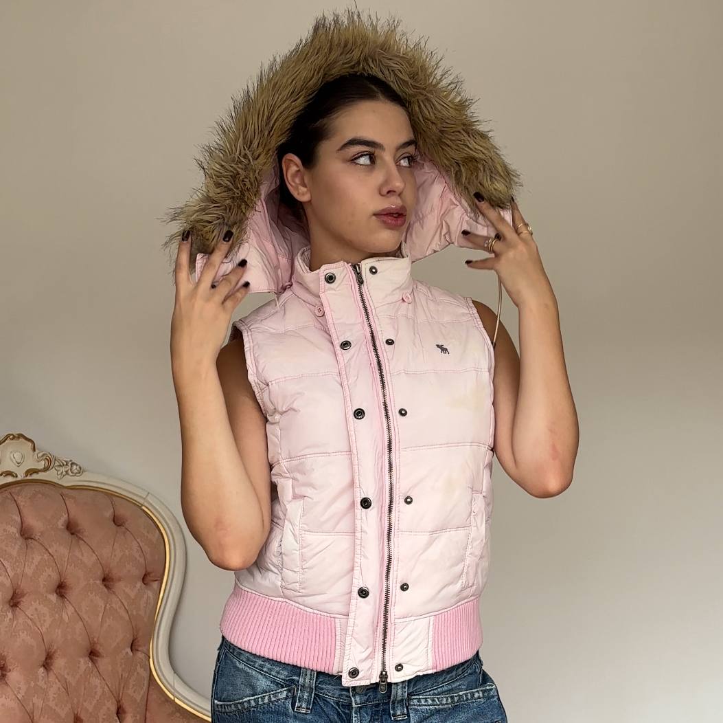 Abercrombie and Fitch sleeveless puffer coat zip-jacket bomber with fur hood in baby pink blue vintage y2k