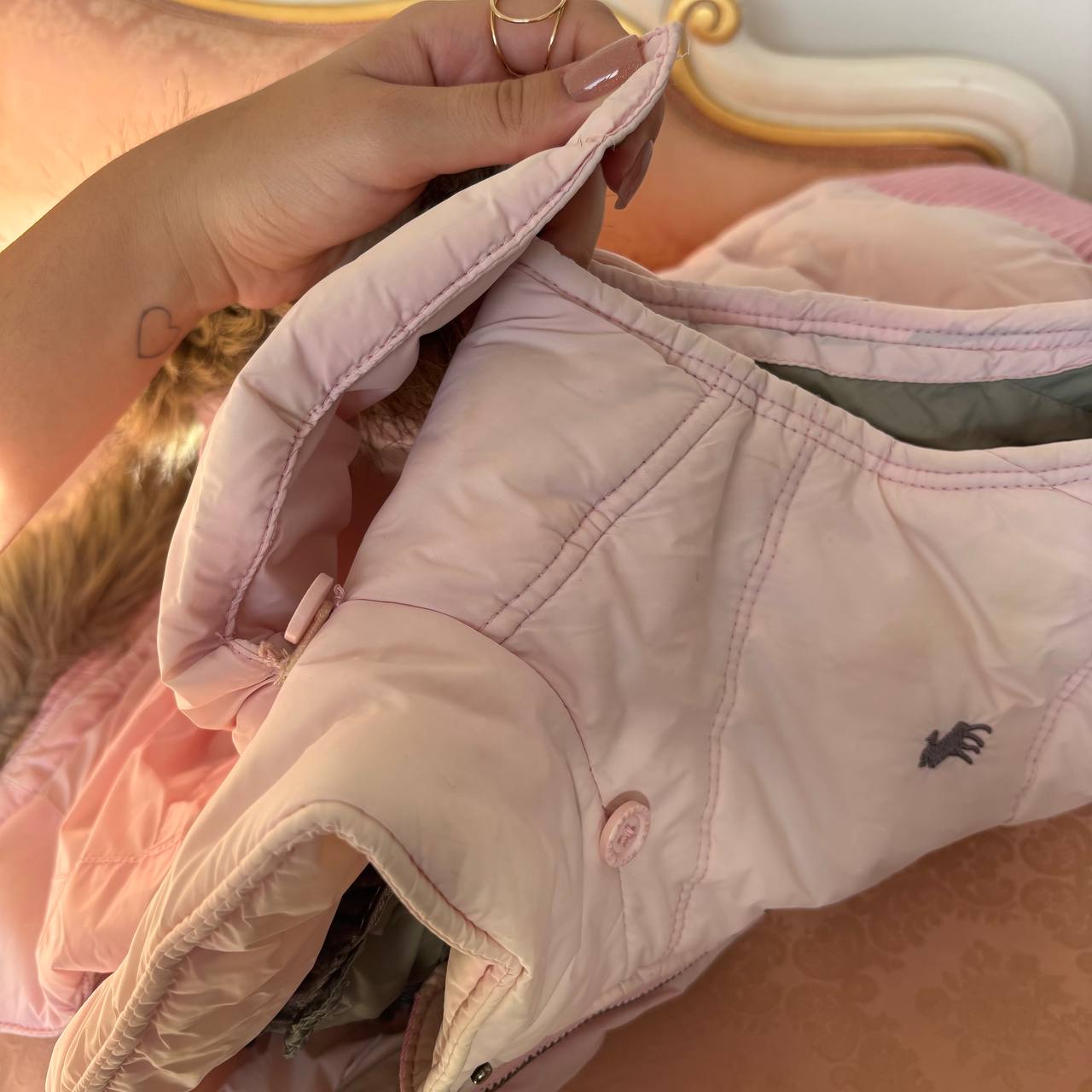 💋 iconic A&F Jennifer’s body style cropped vest sleeveless puffer in baby pink, has a corset effect and beige fur hood
