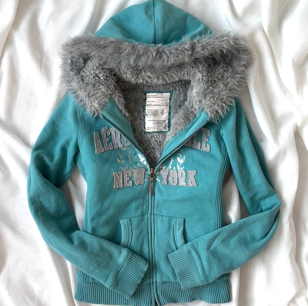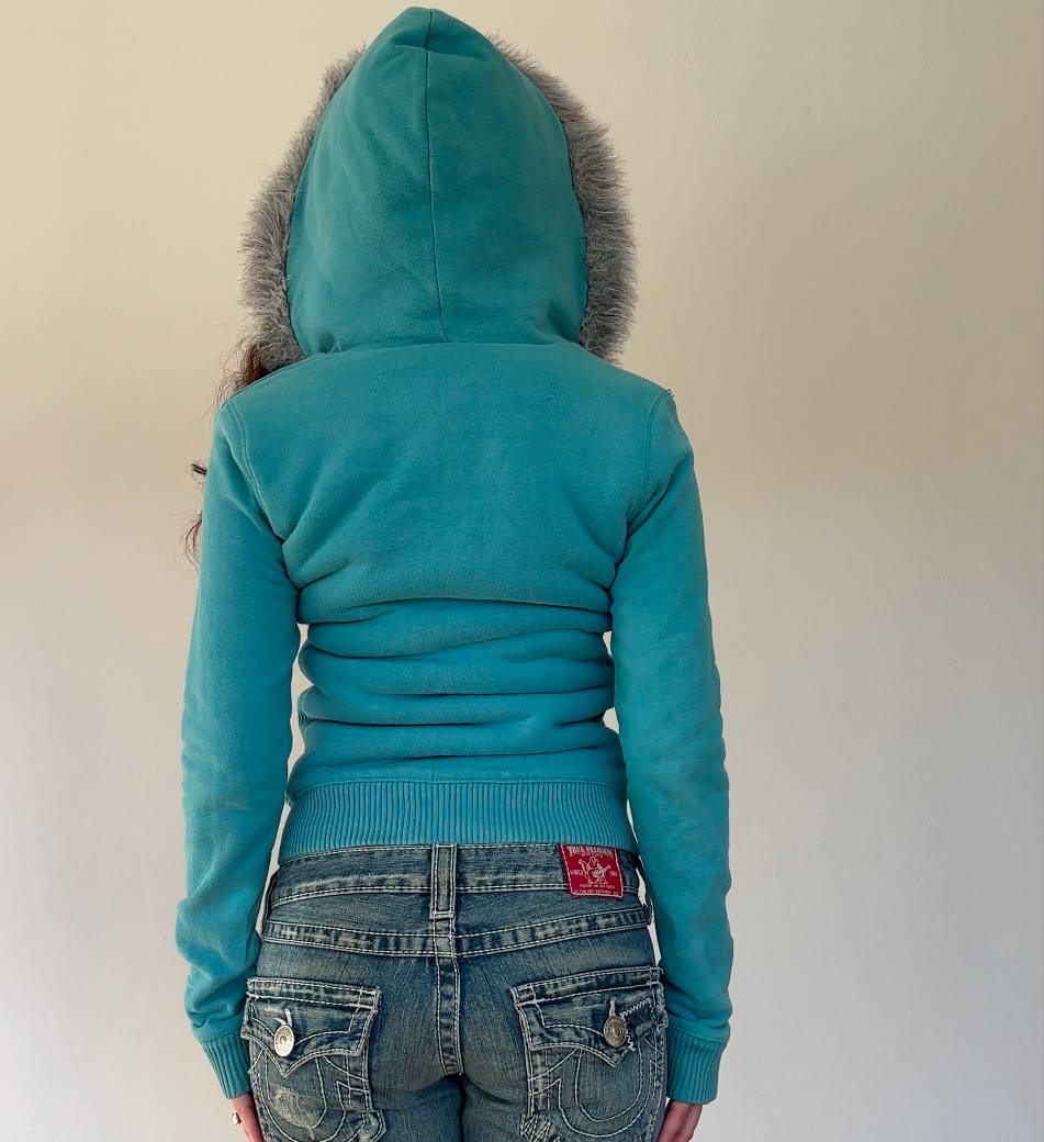 • the rarest Aeropostale hooded warm jumper in blue and grey with fur Jennifer’s body style