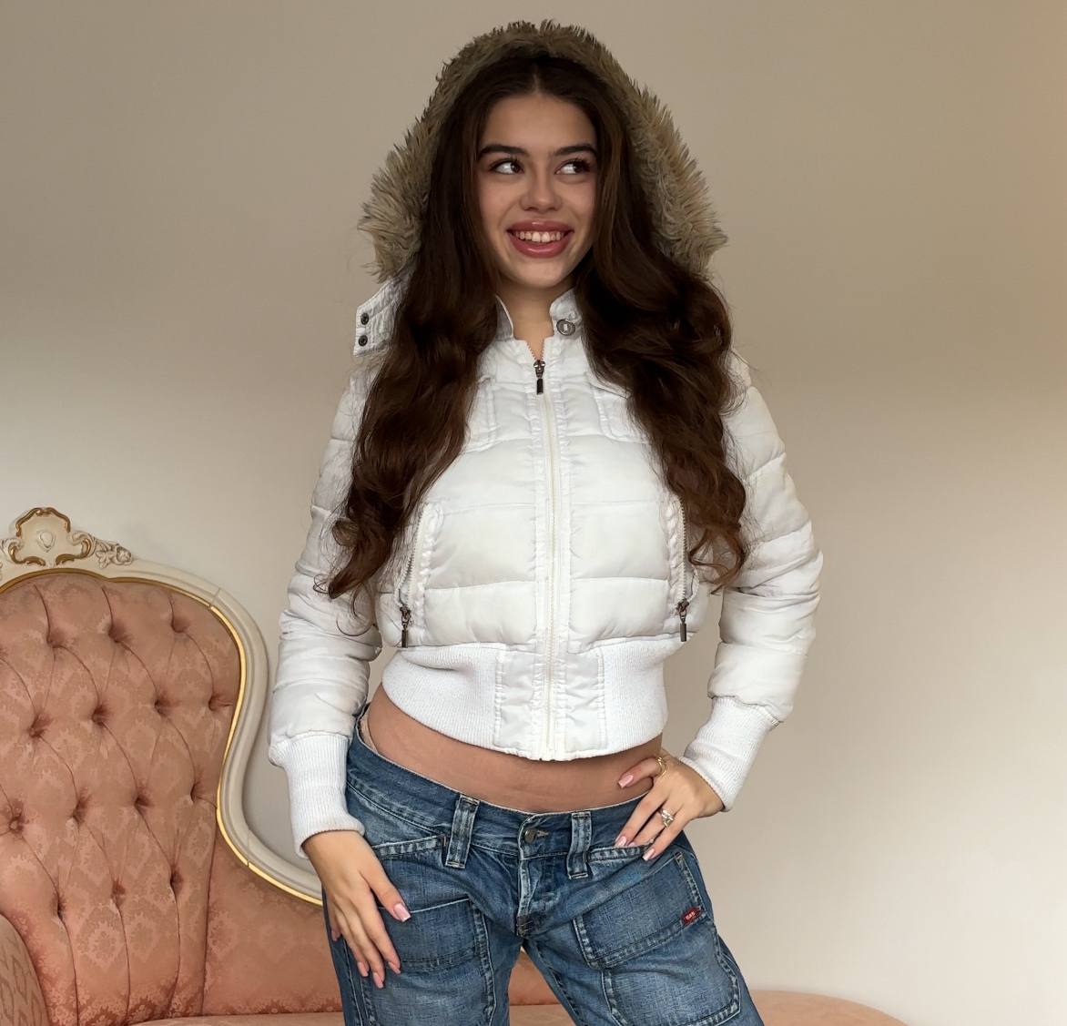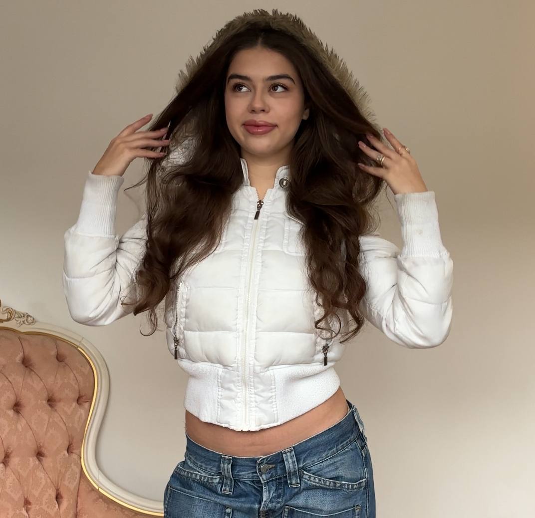 Caprice de fille puffer coat zip-jacket bomber with fur hood in white cropped vintage y2k