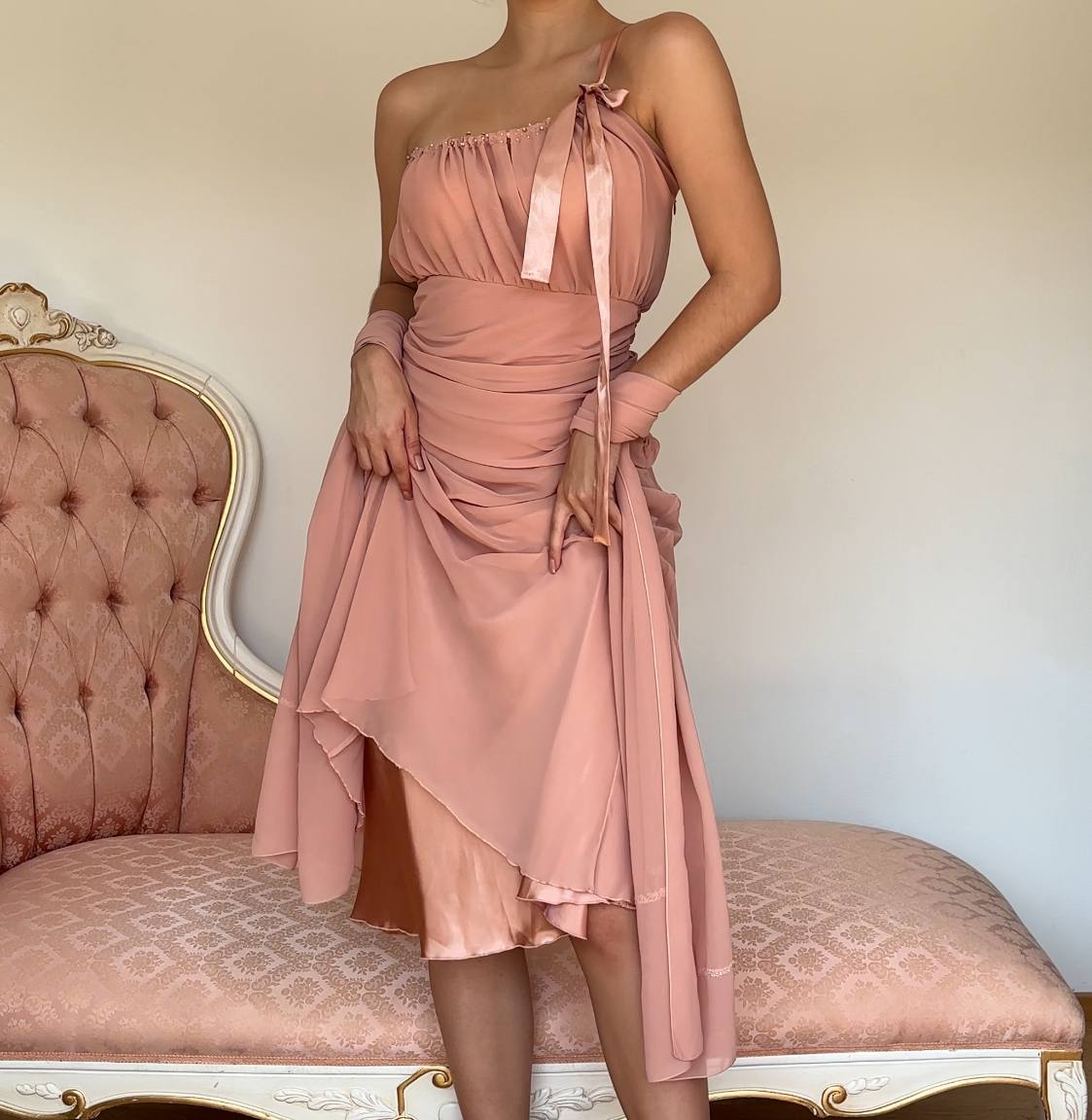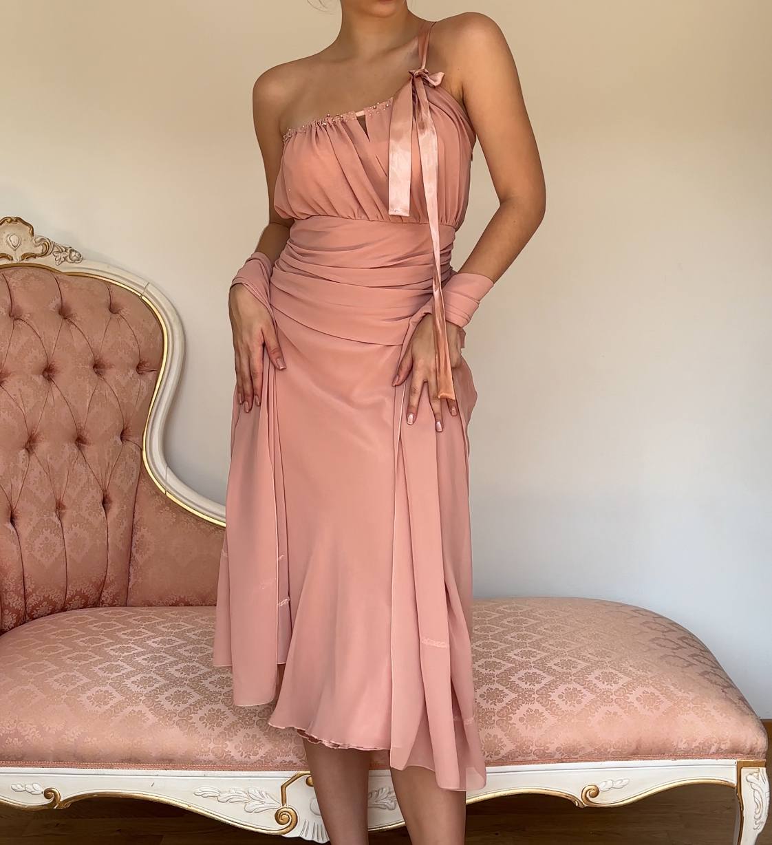 Fairy dress powder rose pink peachy bedazzled asymmetrical one-shoulder embellished midi slip early 2000s y2k mermaid core
