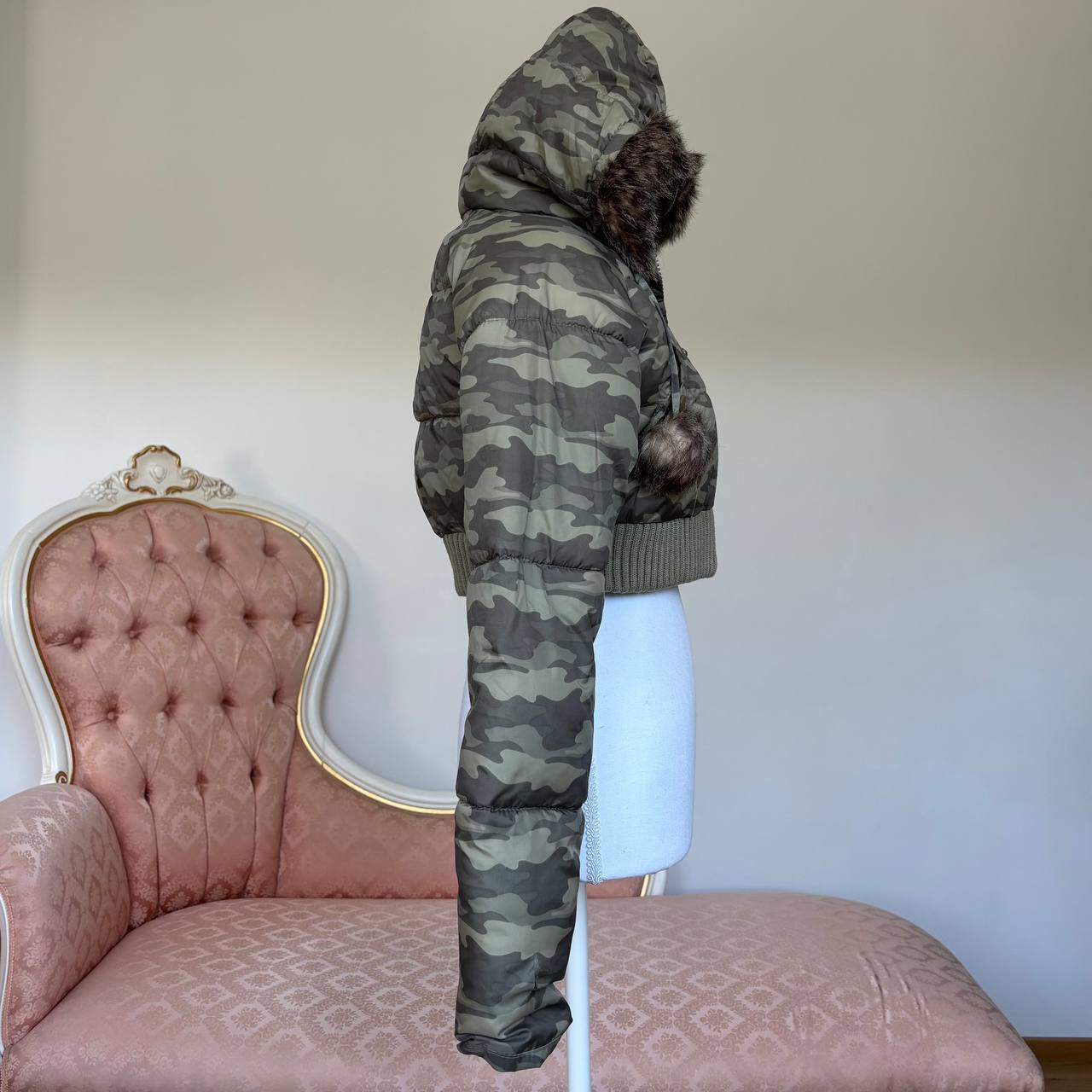 Vintage y2k puffer coat zip-jacket bomber with fur hood in khaki green camouflage military